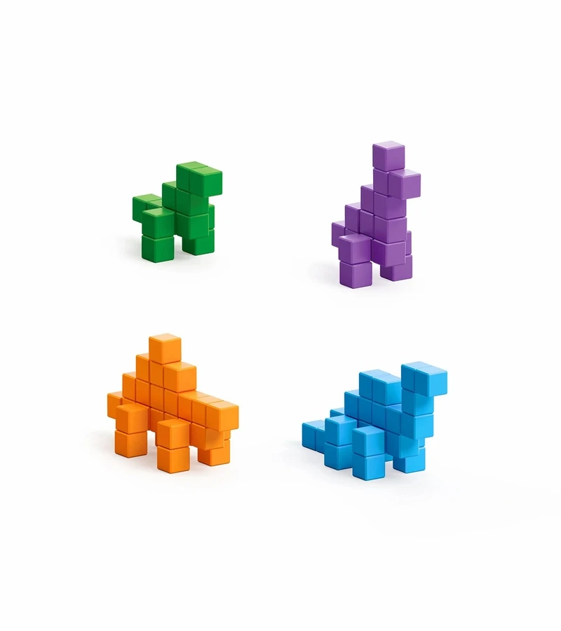 The MINI DINOS set offers 80 PIXIO blocks in 4 colors so that you can build all 4 creatures. Do you know what an orange Dimetrodon is? A violet Parasaurolophus? Discover these ancient species by creating them out of PIXIO blocks. Build your very own dinosaur park.