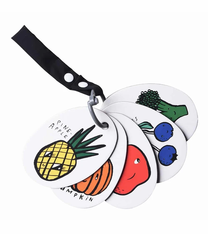 I see Fruits and Veggies in the Market! The ‘I See’ Stroller Cards promote exploring a baby’s world with simple, open-ended prompts. Spot fruits and veggies that are commonly seen while at the market. These five beautifully illustrated cards are super sturdy and held together with a ring and strap that connect to your stroller or bag. Easy to take on a trip but not easy to lose. Take your baby on a fun exploration the Wee Gallery way.