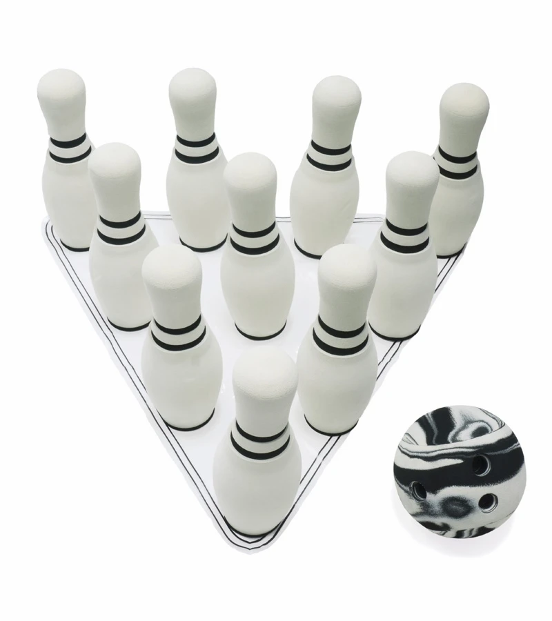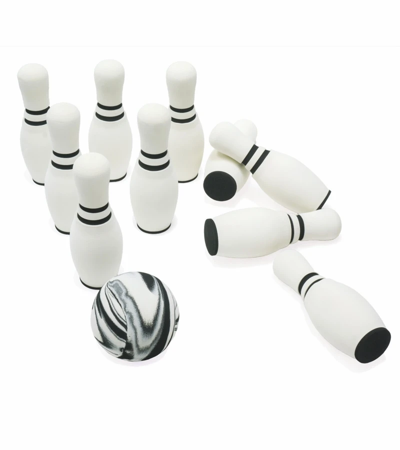 It’s time to STRIKE with our Tike Strike Bowling Set. Made of soft but heavy duty rubber, this set comes with 10 pins, bowling ball with cutouts for 3 fingers, a template to teach how to set up, all inside a nifty backpack carrying bag. There is no time to SPARE, so SCORE!