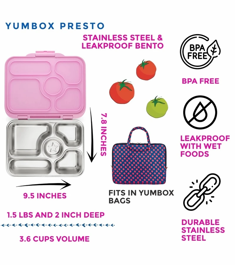 - High Quality & Durable: Yumbox Presto is made using all food-safe materials, BPA-free and phthalates-free. Yumbox is compact & lightweight.Â