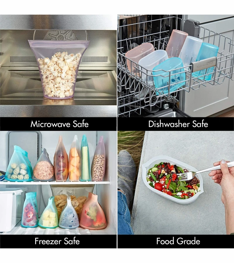 - Made in the USA! 100% pure non-toxic platinum silicone is completely free of BPA, lead, PVC, latex and phthalates. They won’t leach harmful chemicals like plastics can. The only containers that stand up, stay open and zip shut!